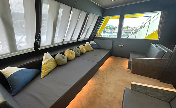 コンセプトは「船まるごと初島」。外装は初島の岩石をモチーフにした黒をベースに、熱海発祥の国産レモンをイメージした黄色をアクセントとして入れています。