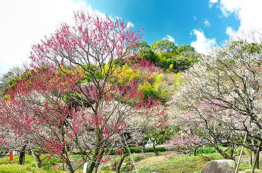 園内では樹齢100年を超える古木を含め、60品種・469本の梅が咲き誇ります。早咲き・中咲き・遅咲きと順番に開花するため、長期にわたり梅の花を見ることができます。