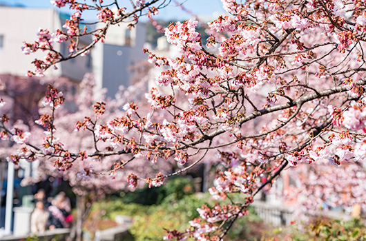 あたみ桜は熱海市の木に指定されており、糸川沿いに多く植えられています。1月上旬から中旬に開花する早咲きの桜で、一カ月以上花を咲かせます。