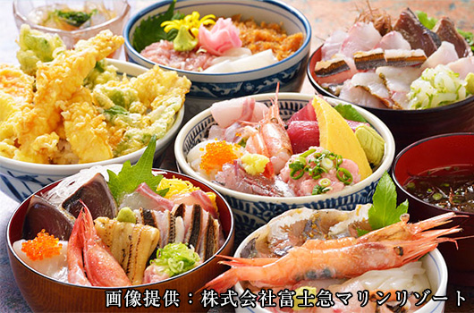 初島の漁師が営む食堂を中心とした17店舗が、地魚やエビ、伊豆の名産アシタバなど、旬の食材を使用したオリジナルの丼ぶりを提供します。