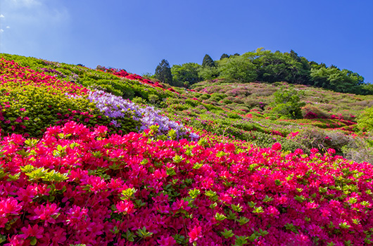 姫の沢公園では、約60,000株のツツジが山の斜面を鮮やかなピンク色に染め上げるころ、花まつり「つつじ・こいのぼりまつり」が開催されます。期間中、園内には約160匹のこいのぼりが飾られます。