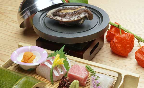 お食事 | 2食付(夕食:季節の懐石料理+活き鮑の踊り焼き/朝食:和食膳) |